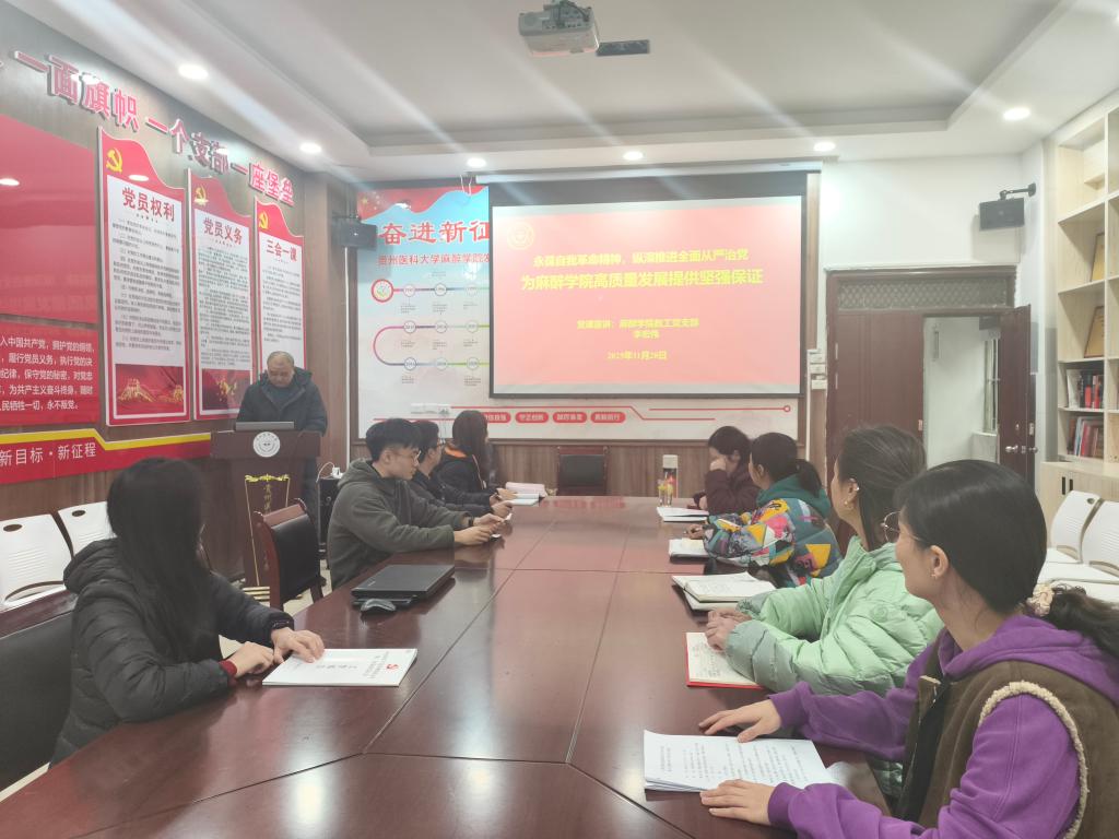 为深入学习贯彻习近平总书记关于党的自我革命的重要思想,推动全面从严治党在基层落地生根,近日,贵州医科大学麻醉学院教工党支部专题党课开讲。支部书记李宏伟以“永葆自我革命精神,纵深推进全面从严治党,为麻醉学院高质量发展提供坚强政治保证”为主题授课,支部全体党员教师参加学习。