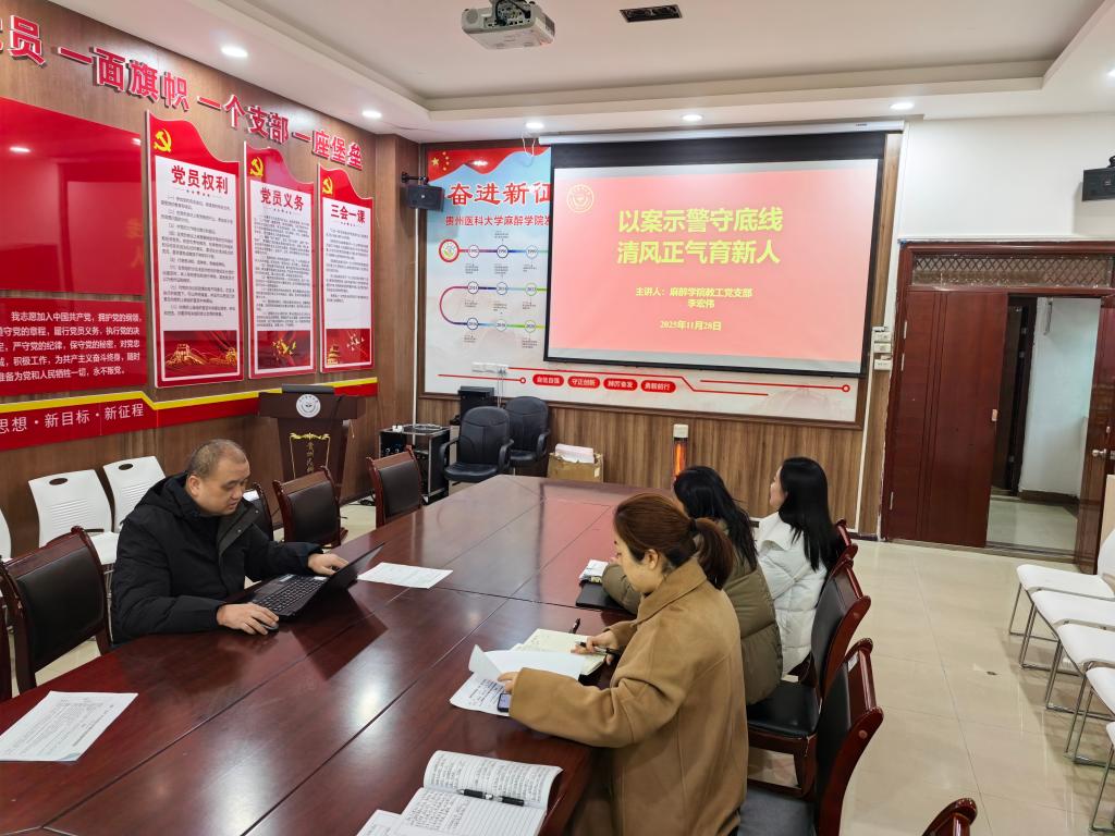 为深入贯彻全面从严治党要求,持续加强党风廉政建设,筑牢党员教师廉洁从教思想防线。11月28日,麻醉学院教工党支部召开专题党课,党支部书记李宏伟以“以案示警守底线、清风正气育新人” 为主题,为党员教师授课。